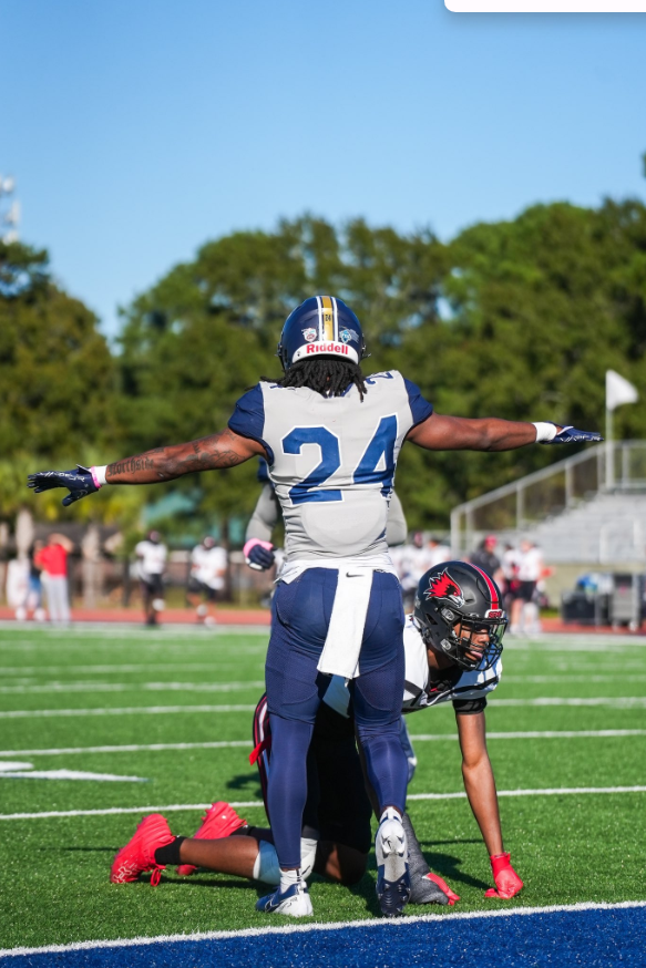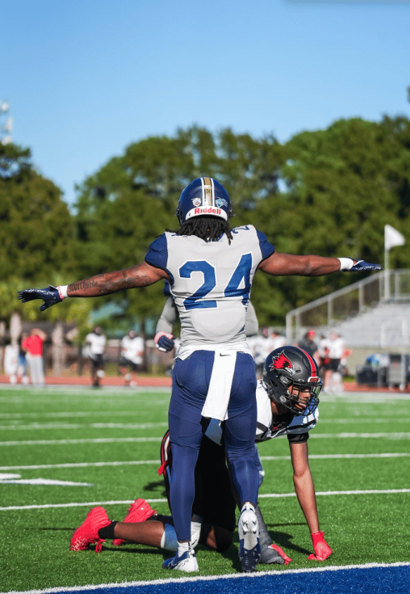 Ja'Kobe North (24) celebrates a forced incompletion against Southeastern Missouri University.