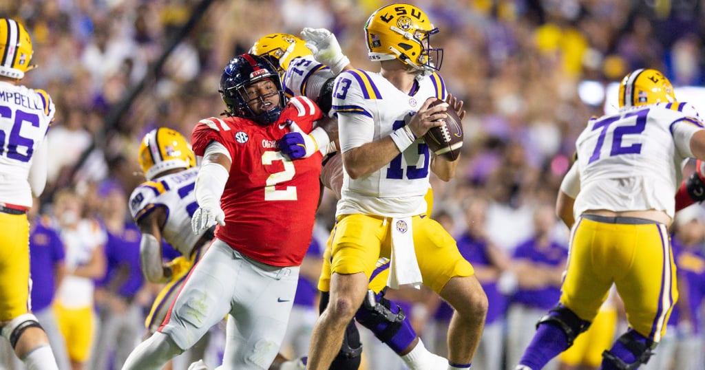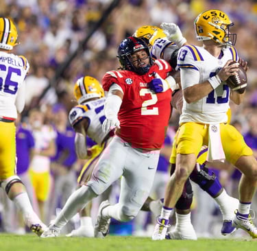 Ole Miss defensive lineman Walter Nolen (2) fights through a block in pursuit of LSU quarterback Garrett Nussmeier on October 12, 2024. (Stephen Lew)